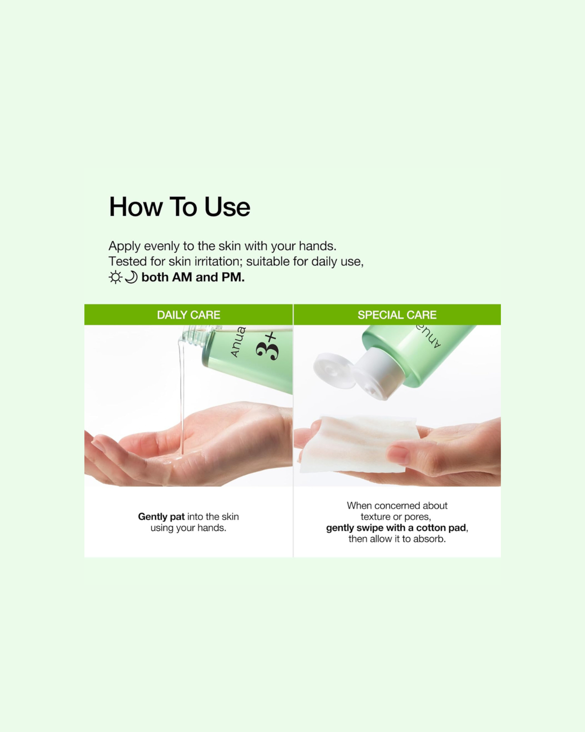 After cleansing, apply evenly to the skin with your hands. Tested for skin irritation; suitable for daily use, both AM & PM.