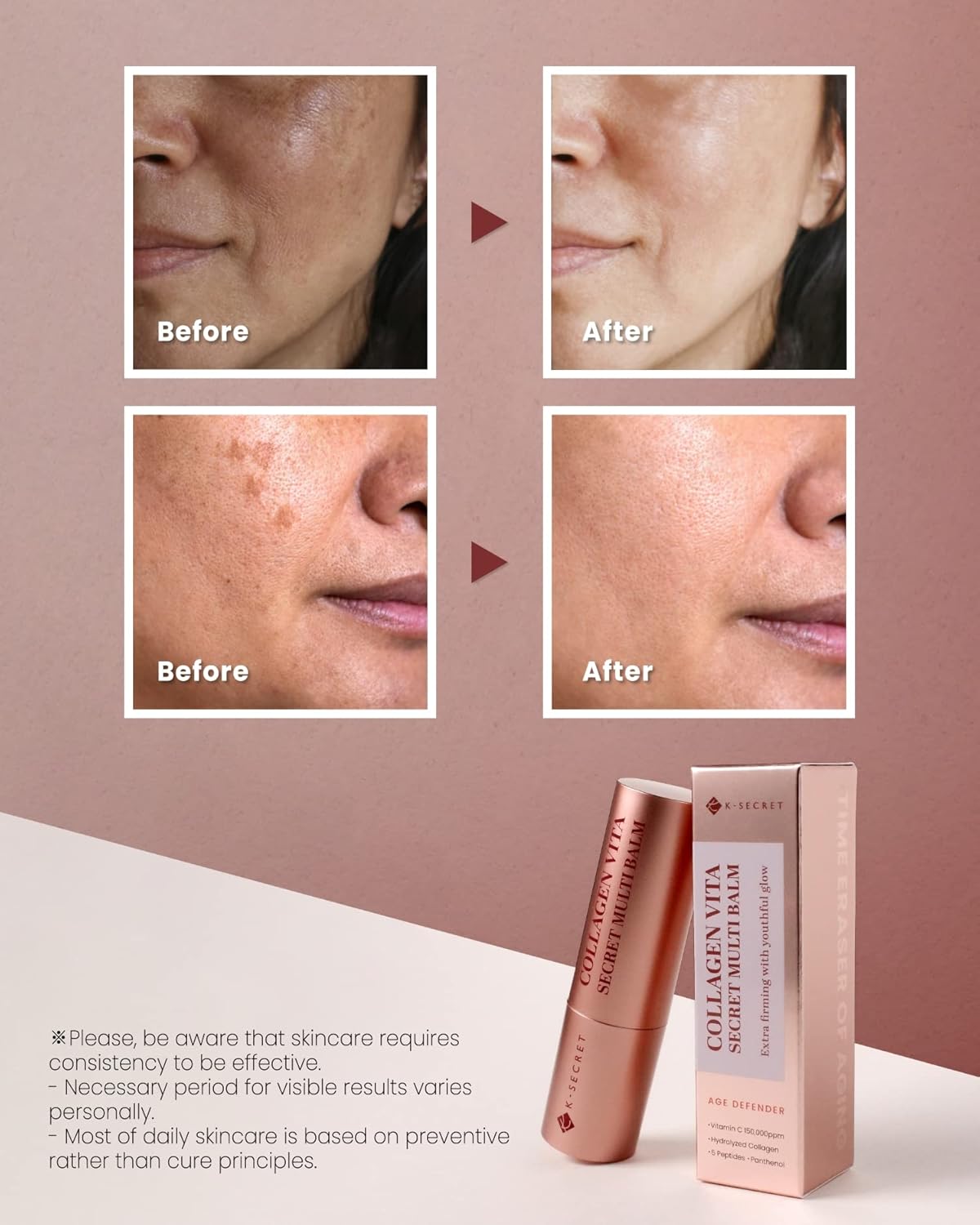 K-Secret Collagen Vita Secret Multi Balm is a versatile, all-in-one skincare balm designed to provide intense hydration and nourishment for your skin. This multi-purpose balm can be used on dry spots, lips, elbows, or anywhere that needs extra moisture. Formulated with nourishing ingredients, it helps to soothe and repair dry, cracked skin while offering a smooth, soft finish. Its compact size makes it perfect for on-the-go use, providing a quick solution for skin that needs a boost of hydration and protection. With its rich, moisturizing texture, this balm is ideal for achieving a healthy, glowing complexion and soft, smooth skin all over.