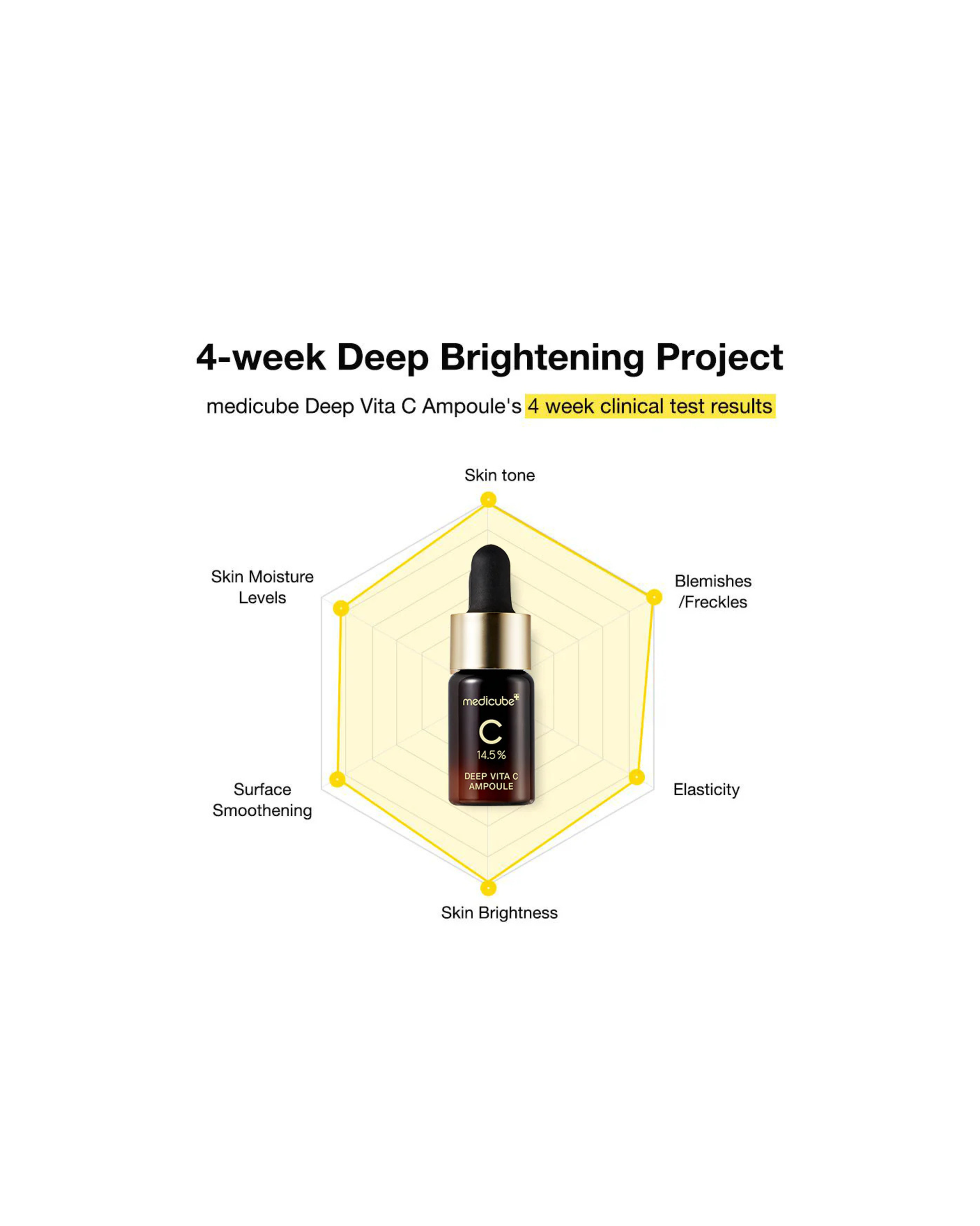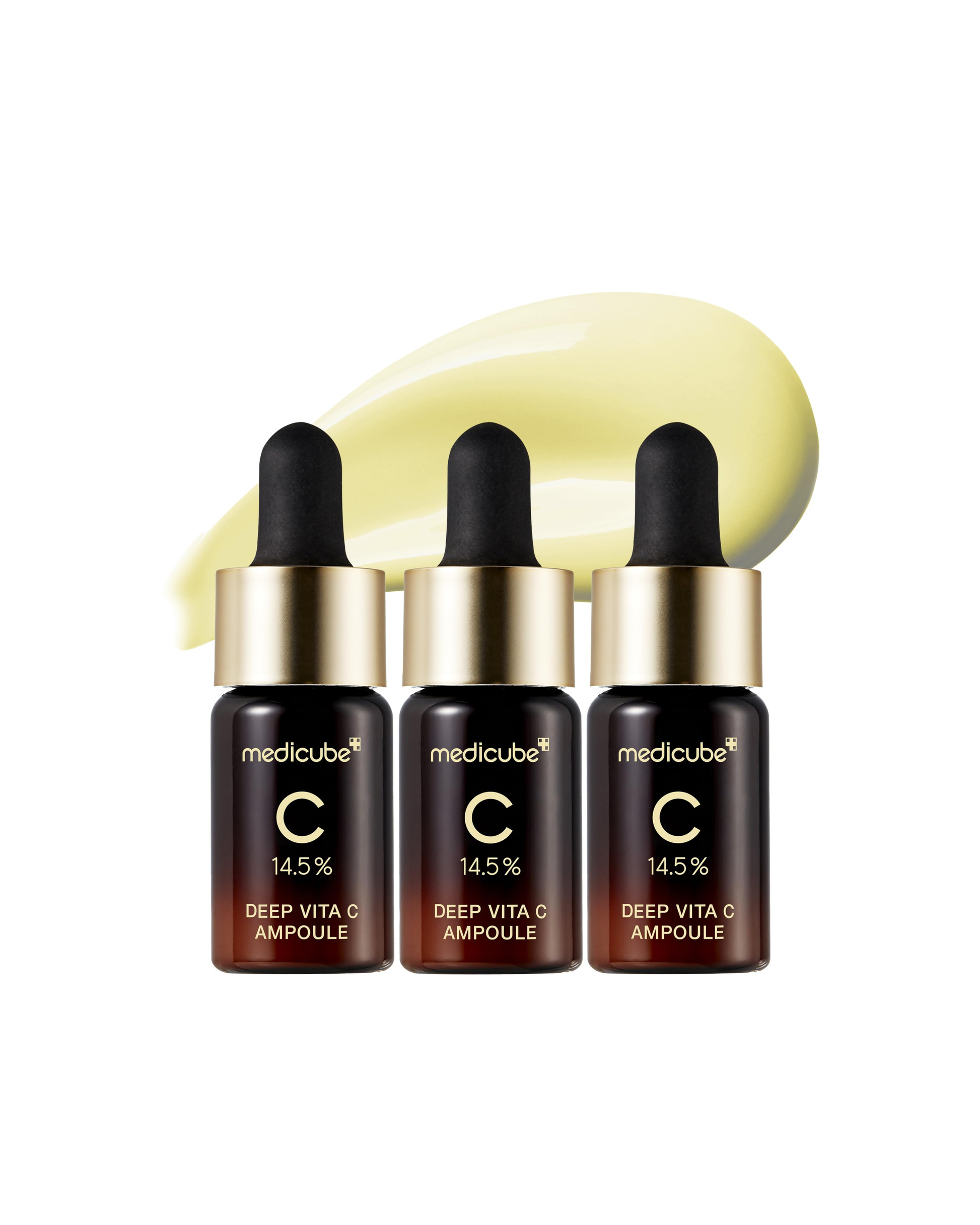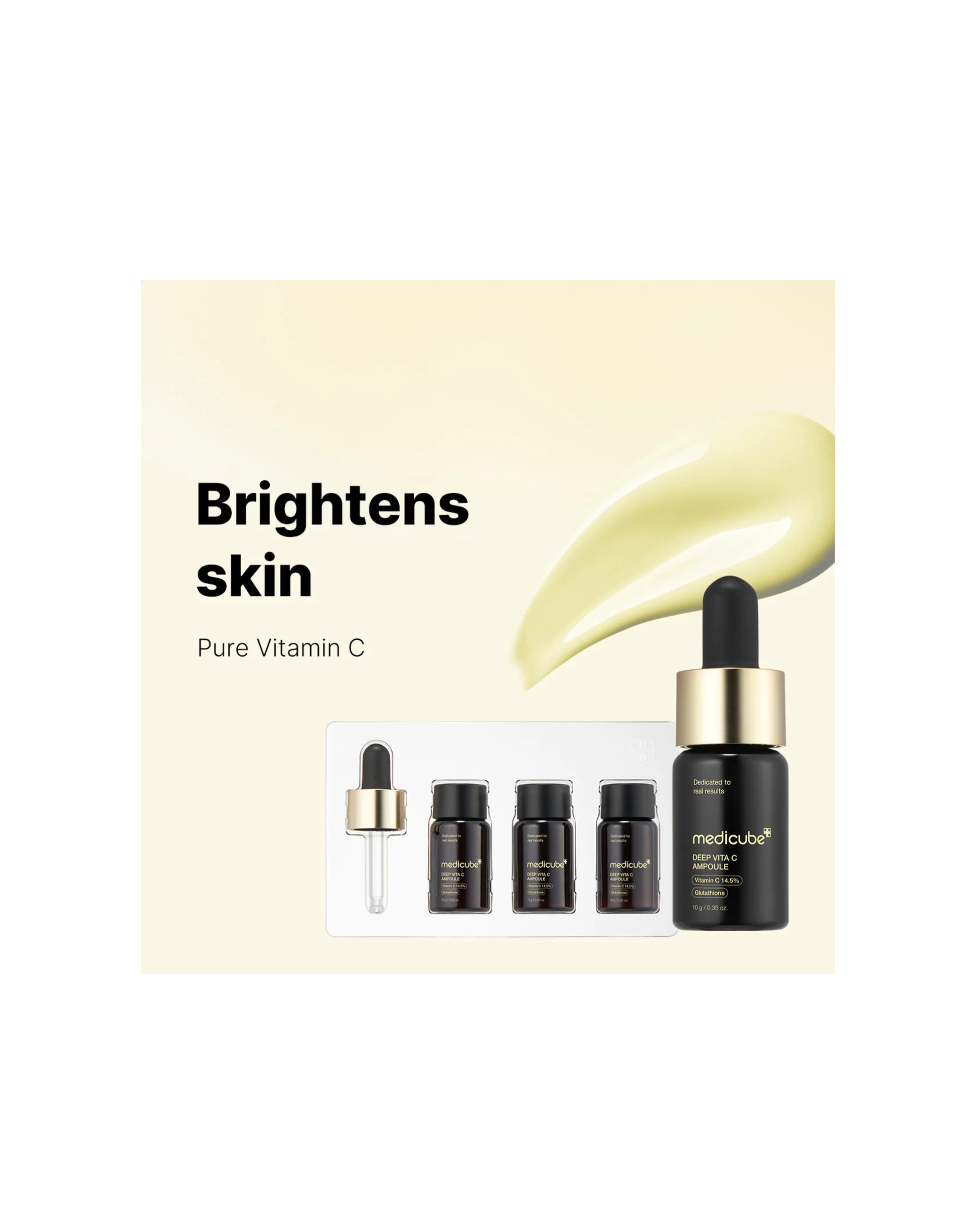 Medicube Deep Vita C Ampoule is a water-based facial serum with 14.5% vitamin C and Alpha-bisabolol to reduce hyperpigmentation, even out skin tone, and enhance skin radiance.