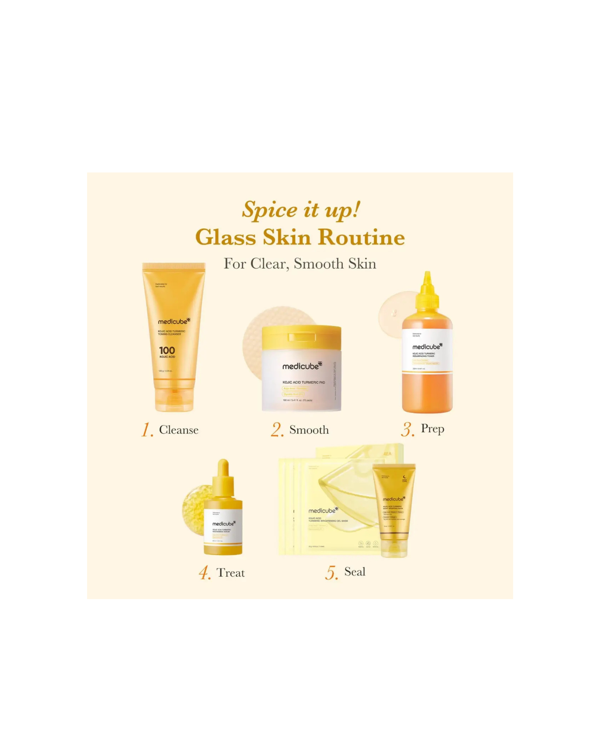- A potent blend of Kojic Acid, Turmeric, Glycolic Acid, and Niacinamide that works in harmony to exfoliate, smooth, and brighten overall skin tone—revealing a clearer, more radiant, glass-like complexion.