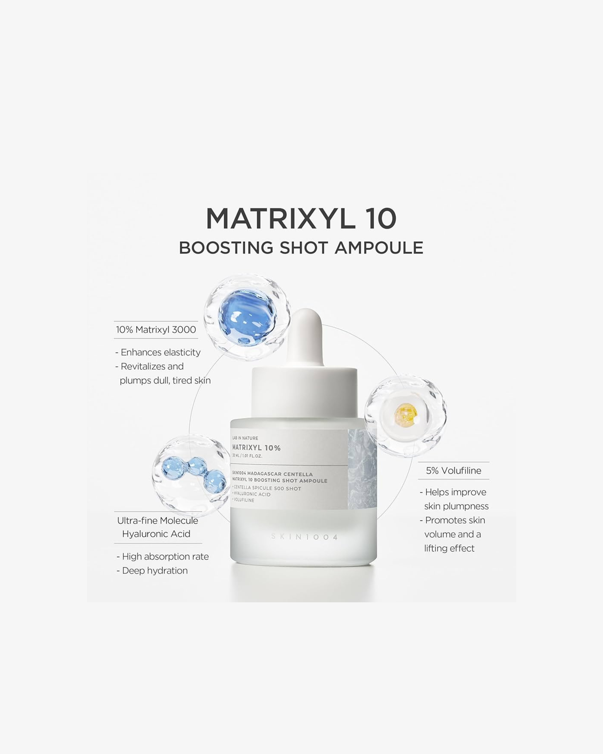 With the power of Matrixyl and hyaluronic acid, the Boosting Shot delivers concentrated ingredients deep into the skin for visible hydration and firmness. This deeply hydrating ampoule features 10% Matrixyl 3000®, Madagascar Centella, and Panthenol, delivered through micro-sized spicules (avg. 13μm)—smaller than the average pore size—for optimized absorption and performance.