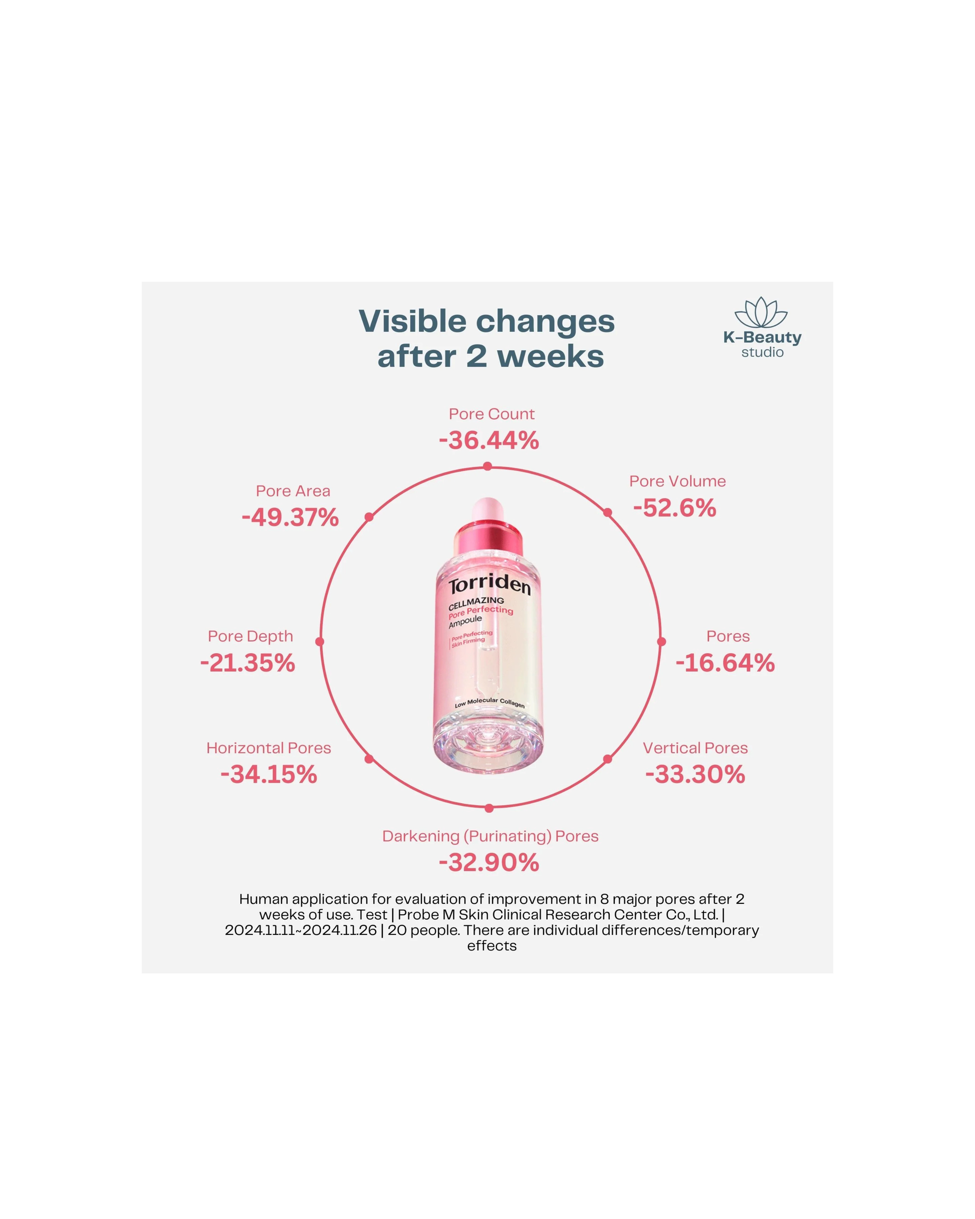 The Torriden Cellmazing Pore Perfecting Ampoule combines 5D low‑molecular collagen, peptides, PHA, and LHA to refine pores, improve elasticity, and gently exfoliate dead skin cells. This lightweight formula hydrates deeply while smoothing texture, leaving skin firm, refreshed and balanced without irritation.